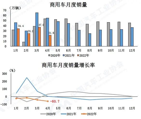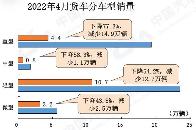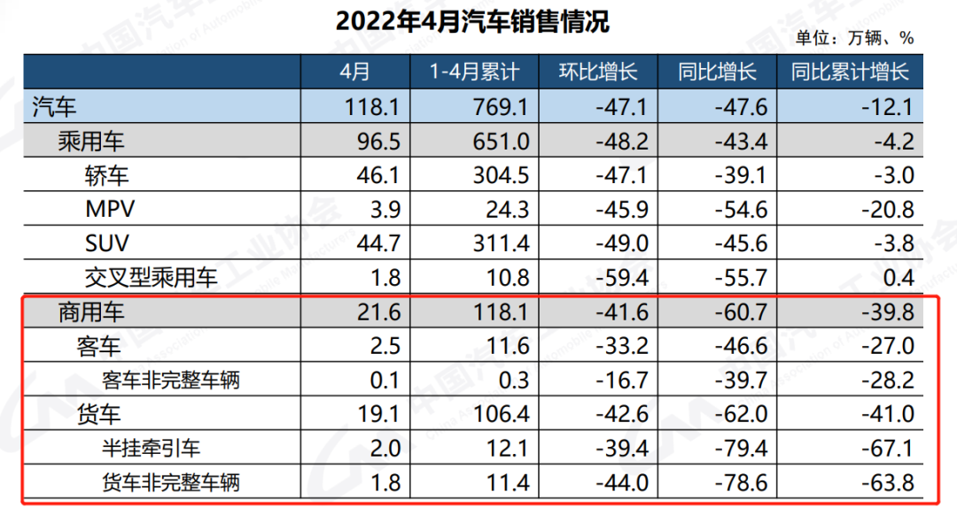 中國(guó)汽車工業(yè)協(xié)會(huì)發(fā)布了2022年4月汽車產(chǎn)銷數(shù)據(jù)。數(shù)據(jù)顯示,4月商用車銷21.6萬輛,環(huán)比下降41.6%,同比下降60.7%。其中,重卡銷4.4萬輛,下降幅度最為明顯;輕卡銷10.7萬輛,降幅也超5成。