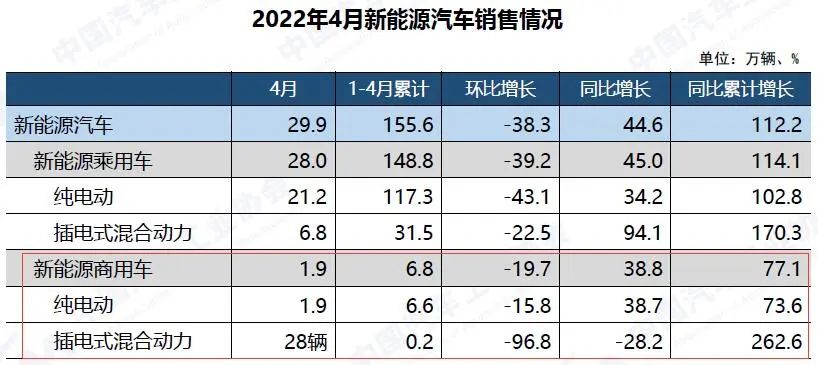 新能源方面依舊是為數(shù)不多的市場(chǎng)閃光點(diǎn)之一。4月,新能源汽車產(chǎn)銷環(huán)比雖然有所下滑,但同比依然保持較快增長(zhǎng):4月產(chǎn)銷分別達(dá)到31.2萬輛和29.9萬輛,環(huán)比下降33.0%和38.3%,同比增長(zhǎng)43.9%和44.6%,市場(chǎng)占有率達(dá)到25.3%。1-4月,新能源汽車產(chǎn)銷160.5萬輛和155.6萬輛,同比增長(zhǎng)均為1.1倍,市場(chǎng)占有率達(dá)到20.2%。其中,4月,新能源商用車銷1.9萬輛,同比增長(zhǎng)38.8%;1-4月,新能源商用車?yán)垆N6.8萬輛,同比增長(zhǎng)77.1%。