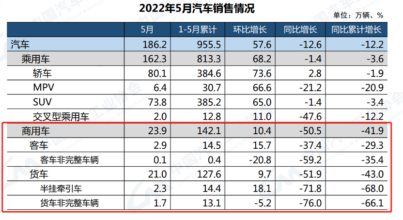 貨車方面,5月,貨車產(chǎn)銷19.6輛和21萬輛,環(huán)比增長5.8%和9.7%,同比下降47.9%和51.9%;1-5月份,貨車累計產(chǎn)銷127.8萬輛和127.6萬輛,同比下降40.3%和43%,累計降幅相比1-4月數(shù)據(jù)繼續(xù)擴大。
