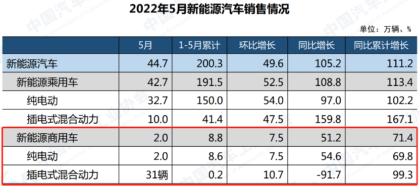 其中,5月,新能源商用車銷2萬輛,環(huán)比增長7.5%,同比增長51.2%;1-5月,新能源商用車累銷8.8萬輛,同比增長71.4%。