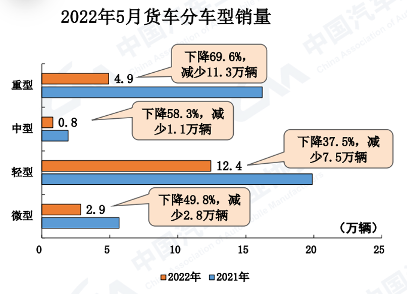 5月,重型貨車銷4.9萬輛,較去年同期減少11.3萬輛,同比下降69.6%;1-5月,重型貨車累計銷32.5萬輛,同比下降63.4%。
