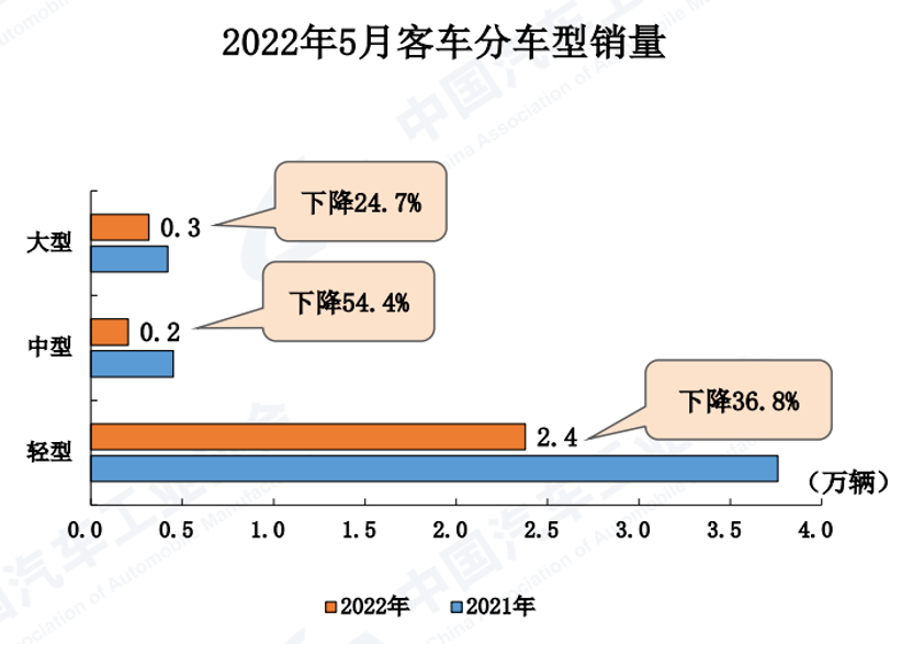 5月,輕型客車銷2.4萬輛,同比下降36.8%;1-5月,輕型客車累計銷12.1萬輛,同比下降30.7%。